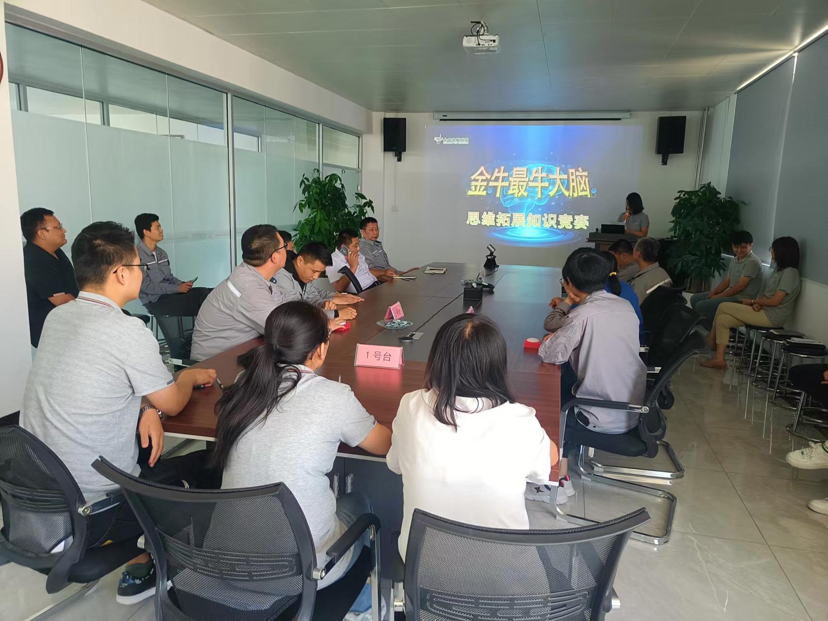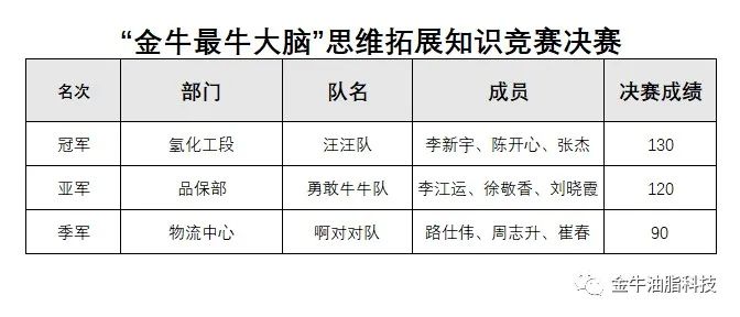 為了豐富員工的業(yè)余?活,充分展?員工才華,激發(fā)學(xué)習(xí)興趣,發(fā)現(xiàn)和培養(yǎng)?才,全?提?員?綜合素質(zhì)。2022年9月28日,青島金牛油脂科技有限公司首屆“金牛最牛大腦”思維拓展知識競賽在生產(chǎn)綜合樓大會議室拉開帷幕,出席本次競賽的仲裁組領(lǐng)導(dǎo)分別是總經(jīng)理孔令攀、總經(jīng)理助理高建平、生產(chǎn)總監(jiān)張世恒、營銷總監(jiān)李斌、總工程師趙建波,他們的出席確保了本次知識競賽的公平公正。